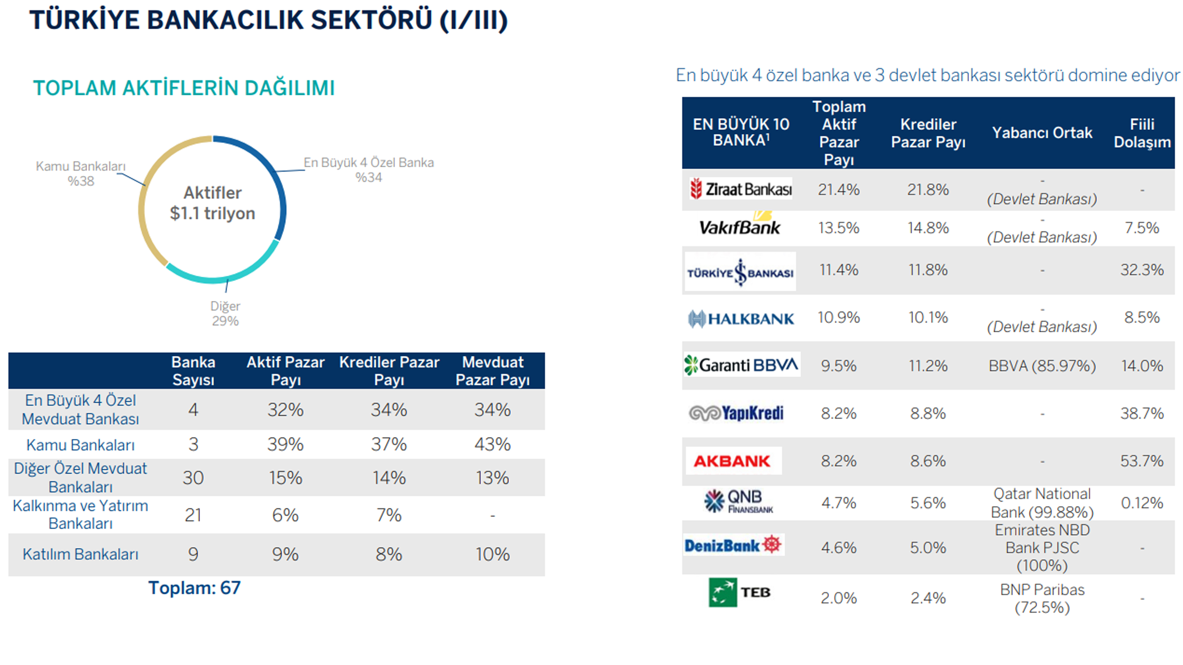 1 İlk 10 banka Haziran 2025 itibariyle sektörün toplam aktiflerinin %81’ini oluşturuyor. Toplam Aktif Payı ve Krediler Pazar Payı mevduat bankaları datasına göredir. Banka sayısı rakamları BDDK aylık verileri baz alınarak hesaplanmış olup, dijital bankalar hariçtir.