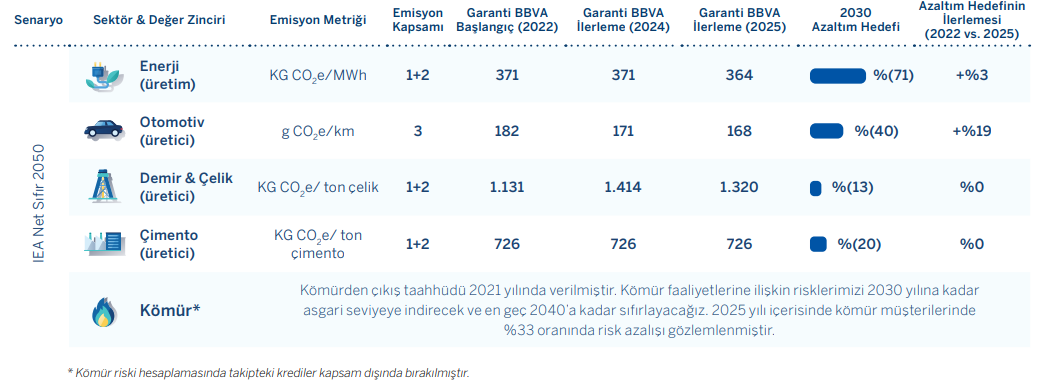Birleşmiş Milletler Çevre Programı Finans Girişimi (UNEP FI) tarafından geliştirilen Bankalar için İklim Hedefi Belirleme Kılavuzları doğrultusunda, Garanti BBVA kredi portföyünü 2050 yılına kadar net sıfır iklim senaryoları ile uyumlu hale getirmeyi hedeflemektedir. 2021 yılında Türkiye bankacılık sektöründe Kömürden Çıkış Planı’nı açıklayan ilk banka olan Garanti BBVA; kömür faaliyetlerine ilişkin risklerini 2030 yılına kadar asgari seviyeye indirmeyi ve en geç 2040 yılında sıfırlamayı taahhüt etmiştir. 2023 yılında ise bu taahhütlerini bir adım öteye taşıyarak enerji, otomotiv, demir-çelik ve çimento gibi karbon yoğun sektörlerde 2030 yılı için dekarbonizasyon ara dönem hedeflerini açıklamıştır.